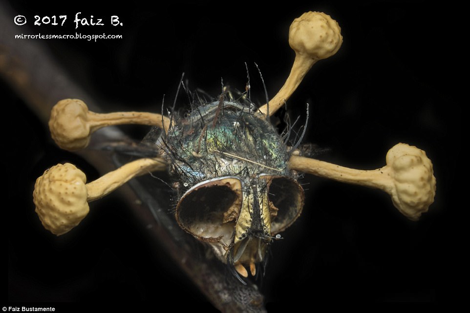 畫面中是一隻死掉的蒼蠅,他被真菌所感染,而且寄生菌也從他的頭中爆出來,畫面相當獵奇。費茲表示這些真菌蟲草應該是在蒼蠅死掉前就寄生在其體內,之後才讓蒼蠅變成這副模樣,就像電影裡面被病毒感染的人一樣。