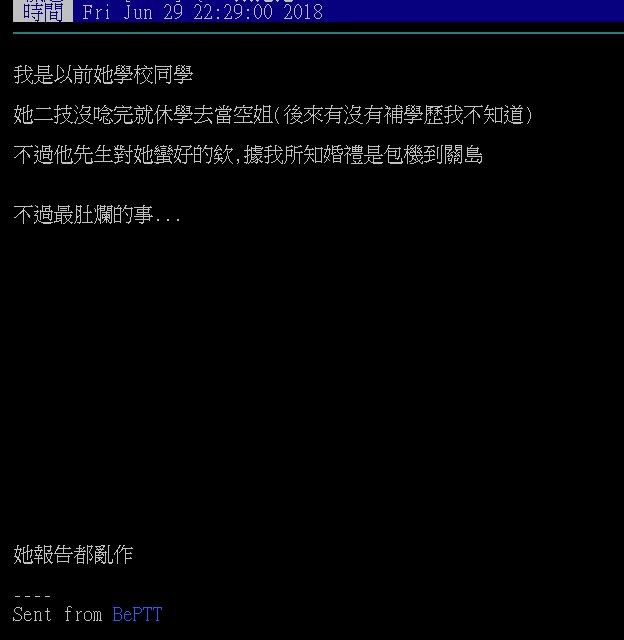 對此事件中的三位主角。空姐、人夫、小王,輪番背起底,甚至還有空姐的同學出來爆料,「我是以前她的同學,她二技沒念完就休學去當空姐,後來有沒有補學歷我不知道,不過她先生對她蠻好的,據我所知婚禮是包機到關島,不過最度爛的是,她報告都亂做。」