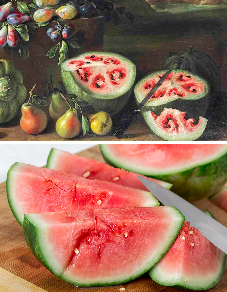 喬瓦尼·斯坦奇 (Giovanni Stanchi) 在17世紀所繪畫的水果,就向世人展示了現今無人見過的西瓜。 科學家設法利用育種將具有白色內部的西瓜改造成我們今天所看到的果肉豐厚的版本。而關於西瓜的演化,其實現在都一直在進行中,像是日本北海道的高級「黑皮西瓜」今年在蔬果市場進行首次拍賣,最高成交價為1顆55萬日圓 (約15萬新台幣) ,非常驚人。