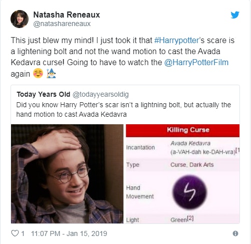 最近在網路上就有網友們瘋傳,其實哈利波特頭上的疤痕不是閃電,而是索命咒的符號,並附上了一張截圖,上面表示索命咒「Avada Kedavra」的施咒手部動作看起來就跟閃電一模一樣,和哈利波特頭上的疤痕不謀而合。