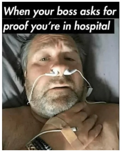 4. 「老闆要你證明你在醫院 (耳塞塞鼻孔,充電線貼手上)」