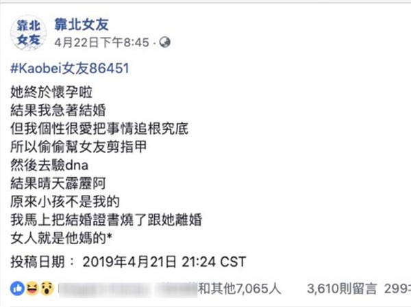 他在文中表示,因為老婆是先有後婚,不知道那天那根筋不對,突然說要去驗小孩,證明小孩是他的,所以他在某次偷偷剪了女友指甲,蒐集起來拿去驗DNA後發現「小孩不是我的」,讓他氣到把結婚證書撕爛還燒掉,吵著說要離婚,過分的是還罵自己的老婆:「女人就是X。」