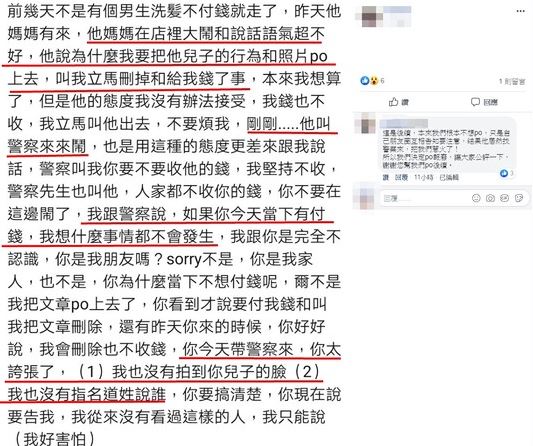 大家不要以為事情就這樣結束,據悉,原PO還表示對方後來因被寫在貼文裡覺得很不滿,對方媽媽甚至來店裡大鬧而且還叫警察過來,原PO隨後再次貼文寫到「這是後續 (如下圖),本來我們根本不想PO,只是自己朋友圈互相告知要注意,結果他居然找警察來,把我們惹火了!所以我們決定PO爆廢,讓大家公評一下」。