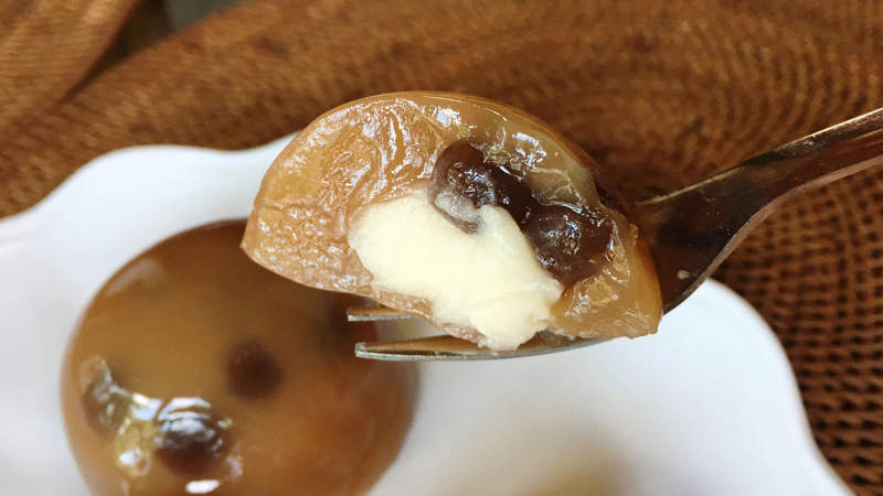 這款看起來晶瑩剔透的水饅頭裡面的珍珠是綠色的,而白色內陷則一樣是牛奶口味。