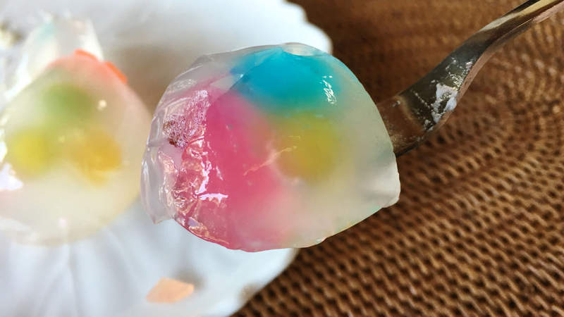 另外一款則是「珍珠水果水饅頭」,裡面除了有珍珠以外,還包含了芒果、草莓、以及彈珠汽水口味的果凍切塊。