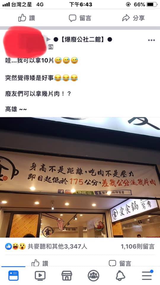不過也有高個子網友留言,「我要倒貼7片」、「那我應該要吐還10片給店家」、「還要給店家8片哪招。」另外,小編搜查後發現這家愛食鍋麻辣鴛鴦火鍋店在高雄與台中都有分店,想去朝聖的網友們抓緊時間喔!