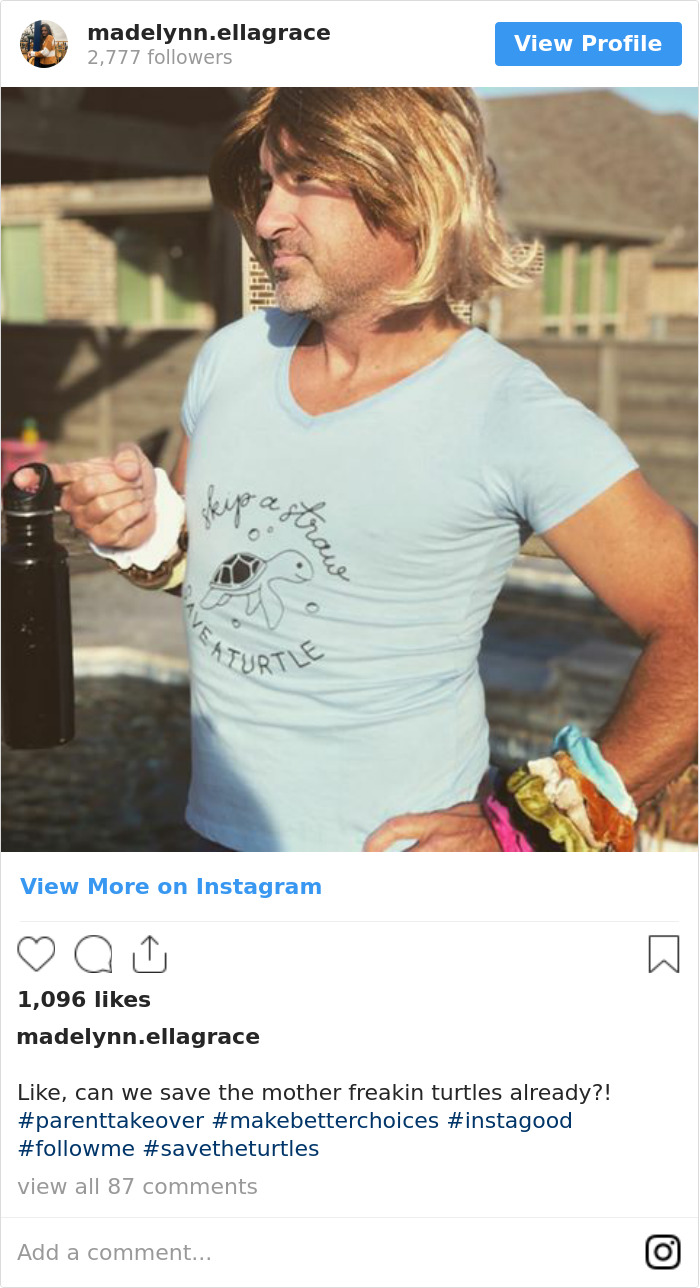 福特從11月11日開始沒收女兒的手機,並掌管了女兒的Instagram和抖音賬號,沒想到他不只是掌管這麼簡單,甚至還在賬號裡面發揮了創意,例如他穿上女裝耍性感的照片: