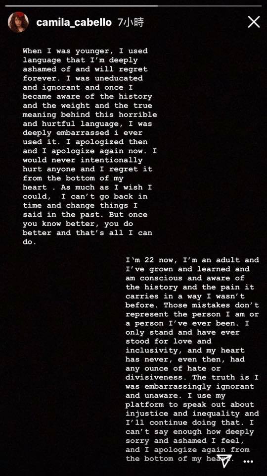 雖然文章與帳號都已經被刪除,22歲的卡蜜拉也隨即在社交平台上發表了冗長的聲明,說自己打從心底感到相當抱歉,也承認那些的確都是她寫的,自己現在已經徹底的改變,希望大眾能再給予機會。但其實這已經不是她第一次為了歧.視而道歉。