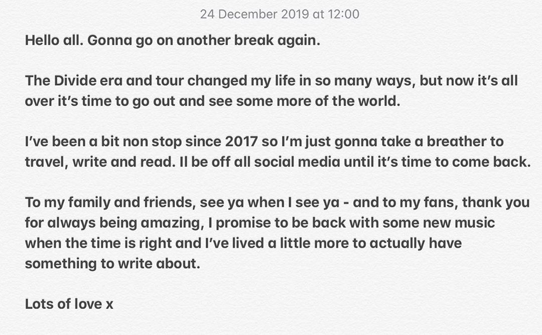 他寫下:「嗨嗨各位,我要休息了,世界巡迴演唱會在各種方面來說都大大改變了我的生活,不過現在終於完美落幕,我覺得現在也差不多是我出去看看這個世界的時候了。我從2017年開始就未曾停歇,所以我覺得我需要一個旅行或是閱讀的喘息空間,在時機到了之前我我不會更新任何社群媒體。」