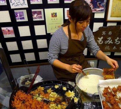 由於楓葉本身沒有味道,必須想製作這份料理,必須先把楓葉鹽漬一年,炸之前再沾上面糊,最後加糖和芝麻伴食,最後就油炸成「紅葉天婦羅」啦!而且不要看這種小吃很稀奇,想吃它的人都必須排長長的人龍才能買到!