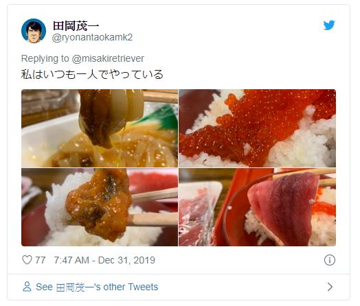 「之前在推特上看到『帶著下飯配菜』的白飯會覺得羨慕,於是也在我家舉辦。明太子跟鮭魚鬆超好吃。真是太犯規了。」
