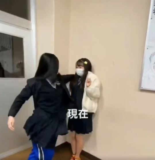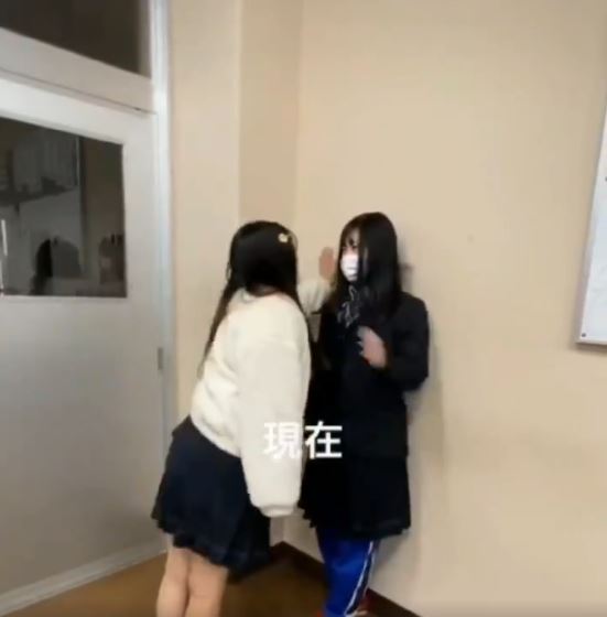 影片中可以看到兩個戴著口罩身穿制服的女學生,一開始白衣的女學生用傳統的壁咚姿勢咚了黑衣女孩,想不到……