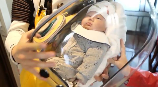 神奇的是,當曹俊傑把孩子放到包包裡面時,他居然一點都不害怕,也完全沒有哭,反而是一臉淡定,可能他也知道爸爸這麼做是為了保護他的安全吧!