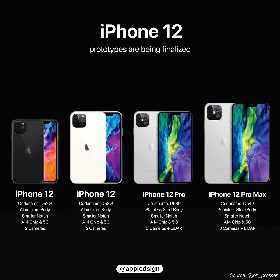 《Concepts iPhone》稱他們從iOS14未公開的圖像中找到了一張設計圖,圖中可以顯示iPhone12系列總共有「iPhone 12」、「iPhone 12 Pro」、「iPhone 12 Pro Max」三種機型,其中最吸睛的部分就是「居然變成4眼怪了」。