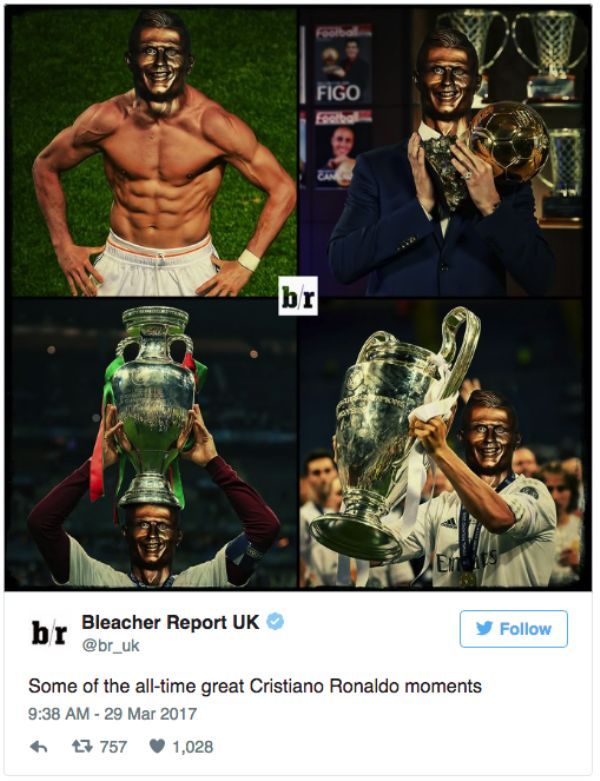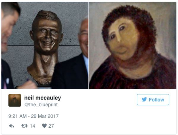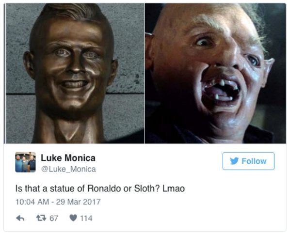 全世界最知名的帥哥足球員,除了永遠的「黃金右腳」貝克漢 (David Beckham) 之外,當然不能忘記葡萄牙好手C羅 (Cristiano Ronaldo)。但說到他就不得不提,在2017年時,曾經有機構為了紀念C羅的戰績,幫他準備了「半身雕像」來祝賀。 不過揭開後的雕像,卻醜到讓所有粉絲們都崩潰,還瘋狂做梗圖開酸,甚至高喊要退貨啦!