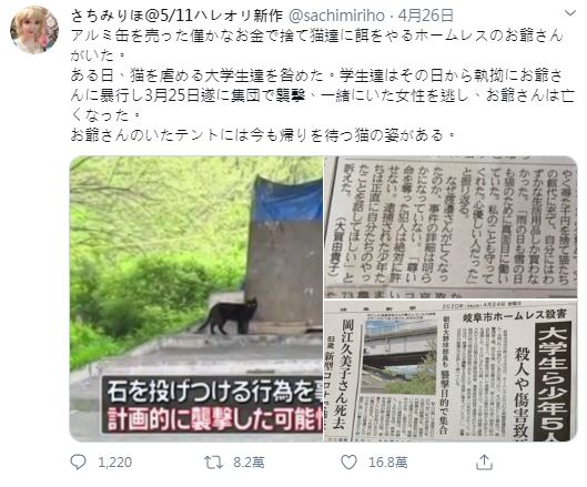 這件事情引起日本社會一片譁然,有位知道渡邊先生的網友也在推特上面發文「有位無歸可家的爺爺平常都靠賣鋁罐賺微薄的生活費,還會買飼料養浪浪。但是有天他指責了虐.貓的大學生之後,那些大學生就開始欺負爺爺,最後在3月25日還襲.擊爺爺,雖然同住的女性友人順利逃走了,不過爺爺就這樣白白犧牲。就連到現在還可以在爺爺住的帳篷外面看到浪貓在等爺爺回來。」