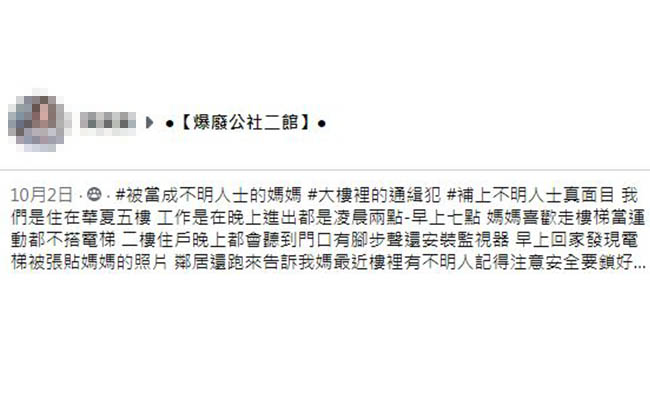 網友在臉書《爆廢公社二館》上發文,原來她家住在5樓,平常因為工作時間的關係,只有凌晨2點到早上7點會進出家裡。