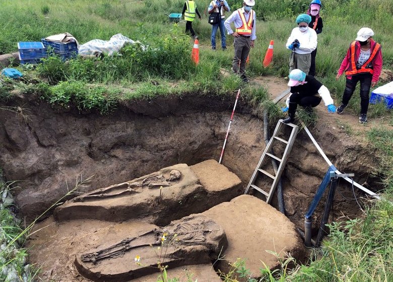 根據負責挖掘的與研究的台灣大學人類學研究所博士顏廷伃表示,兩具出土遺骸年代初判為2500年前,性別是一男一女,年齡屬於中年,姿勢呈現俯臥狀、雙手反揹在後方,並且是對看狀態。目前只能了解兩人有親屬關係,依據當時的文化背景,祖先過世通常會埋葬在居住地下方。