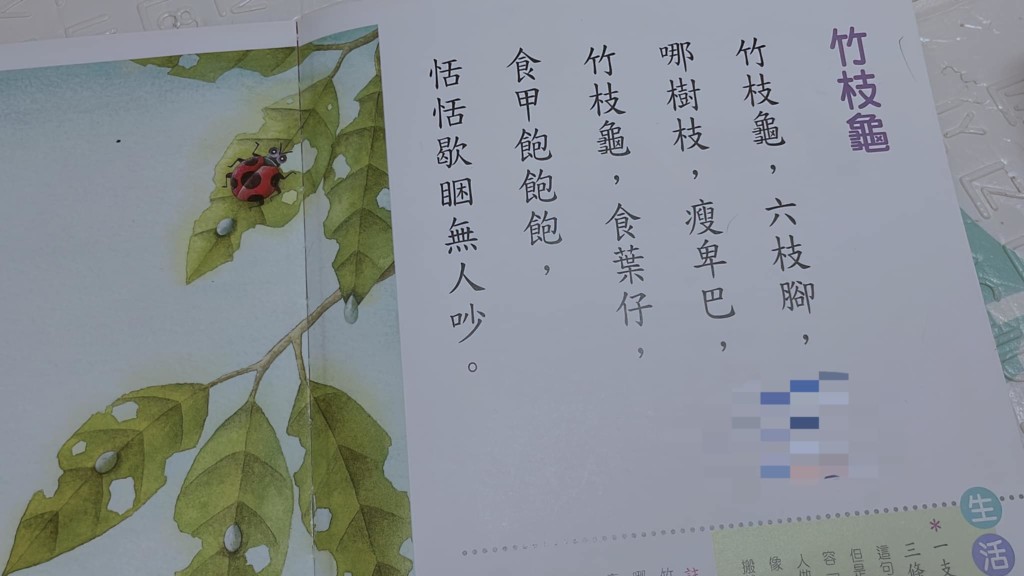 一位心很累的媽媽在臉書社團《爆怨2公社》上發文:「我這輩子沒有一次是敗在語文類,可卻敗在女鵝 (兒) 學校的閩南語課本上。」媽媽本身會講台語,可是看著5歲女兒的台語課本卻卡住,還被女兒嫌棄。課文是在講一種叫做「竹枝龜」的生物,旁邊還出現瓢蟲插圖,網友搔頭亂猜:「飄蟲」、「烏龜?瓢蟲?獨角仙?」、「我以為是什麼可以吃的粿」、「我以為是什麼新品種烏龜,幾甲孤」。