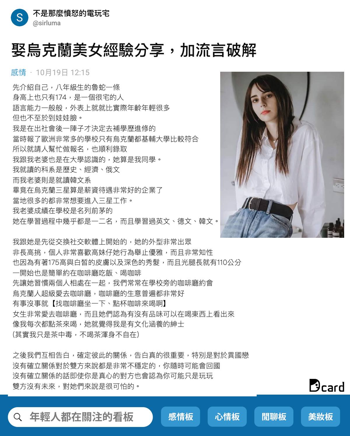 Dcard感情版上,一位8年級男卡友分享娶到烏克蘭正妹的經驗,同時想破解流言。原PO表示自己條件平凡,身高174、語言能力一般,「是一個很宅的人」。兩人是烏克蘭基輔大學的同學,透過交換社群軟體才漸漸熟識。烏克蘭老婆「娜娜」身高175公分,肌膚白皙、雙腿修長,又有一頭深色秀髮,仙氣十足的外表讓原PO印象深刻。他們平常的約會行程也很單純,常常在咖啡廳聊天用餐,或是在廣場約會。