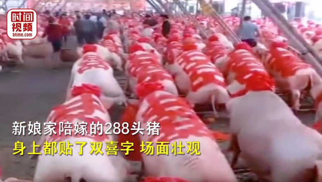 綜合《頭條新聞》等中媒報導,山西省臨汾市洪洞縣一位劉姓養豬戶嫁女兒,在婚禮上準備了288頭豬隻,每頭豬身上都貼了斗大紅色「囍」字,場面著實壯觀。一般人準備嫁妝通常是禮金或是金銀財寶,養豬戶千金的終身大事則是豪奢宰了百頭豬陪嫁,展現與眾不同的大氣。