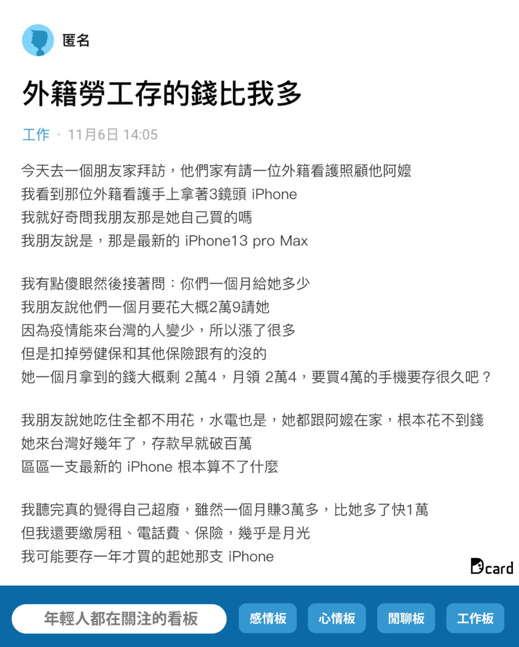 上週六 (6) 一位男卡友在Dcard工作版上表示:「外籍勞工存的錢比我多」。他發現負責照顧朋友阿嬤的外籍移工手上拿著最新的蘋果手機,還是螢幕最大配備最頂級的iPhone 13 Pro Max。一問之下才知道那是看護自己購買的,雖然每個月實領大約2萬4,不過因為吃住通通不用錢,整天和阿嬤在家也沒什麼機會購物,「來台灣好幾年了,存款早就破百萬」。