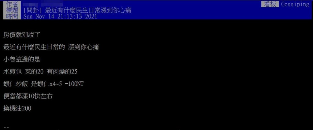 一位鄉民在PTT八卦版上表示周遭生活圈的物價上漲,不只荷包哭泣,連心都要淌血了。原PO舉例一些越來越貴的平民美食:「水煎包菜的20 (元) ,有肉燥的25 (元) ;蝦仁炒飯是蝦仁4、5顆100元;便當都漲10塊左右。」(樂佩編:天啊100元只有5顆蝦仁的炒飯還算蝦仁炒飯嗎?) 原PO也提問:「最近有什麼民生日常漲到你心痛?」