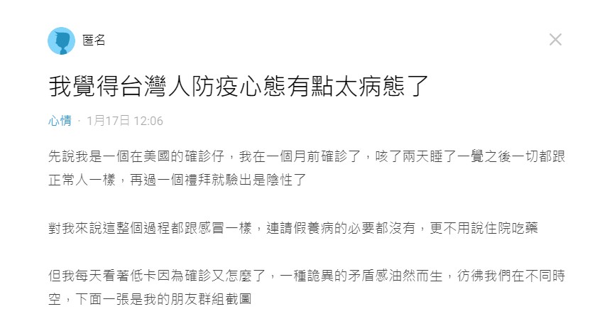 原PO在Dcard發文,稱自己在美國1個月前確診,「咳了兩天睡了一覺之後一切都跟正常人一樣,再過一個禮拜就驗出是陰性了」,指出整個過程就像感冒一樣,「連請假養病的必要都沒有,更不用說住院吃藥」。然而看著台灣人面對疫情的反應,讓他感到有股矛盾感,「彷彿我們在不同時空」。