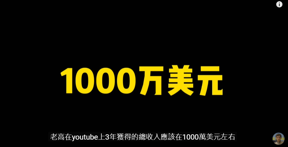 郭煒推估老高3年來從YouTube獲得的總收入大概落在1,000萬美金(約新台幣2億7千萬元) 。看到老高吸金能力超強的一面,郭煒認為那是老高耗費心力的收穫,評論老高的影片雖然並非十全十美,卻也能帶給觀眾「歡笑、價值和想像」。你也喜歡看老高的影片嗎?最喜歡聽老高講哪個主題?