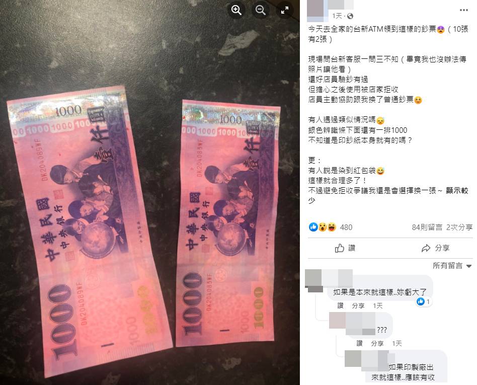 女網友在臉書社團《爆廢公社公開版》分享領到奇怪鈔票的經驗。原PO表示在便利商店領了10張千元鈔票,其中2張居然被染成均勻的粉紅色,銀色防偽條仍正常、底下一排「1000」字樣卻交錯染色。