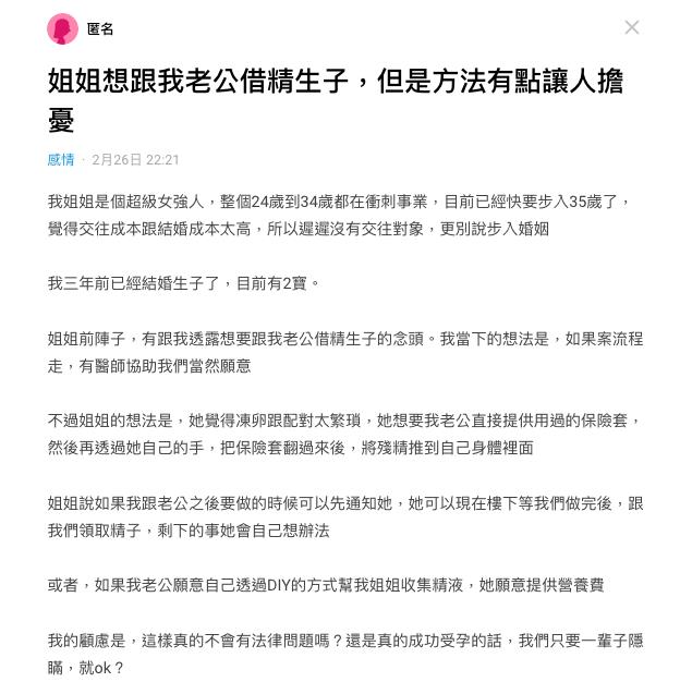 原PO自己本身就有2個孩子,當然希望姐姐也能一圓為人母的夢想,但夫妻兩顧慮「這樣真的不會有法律問題嗎?還是真的成功受孕的話,我們只要一輩子隱瞞,就ok?」