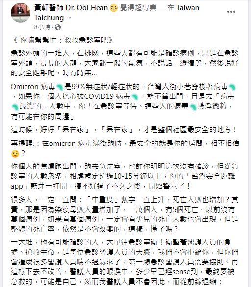黃軒醫師認為,Omicron病毒99%是無症狀或輕症,目前台灣大街小巷都穿梭著病毒,若是擔心被傳染,應該好好待在家,而不是去「病毒最濃」的地方群聚,搞不好明明沒確診,去一趟急診室反而增加染疫風險,「這時候好好呆在家,『呆在家』才是整個社區最安全的地方!」