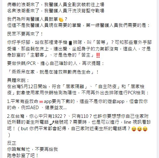 重症醫師黃軒在臉書上發文表示,近日醫院急診室外頭總是一堆人在排隊,卻多半是擔心自己染疫等候篩檢的人潮,而不是真的需要緊急醫治的患者。大量「可能」確診的民眾往急診室衝,不僅造成醫護人員負擔,也可能耽誤他們搶救生命的黃金時間。