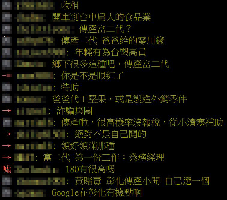 消息一出,立刻湧進不少留言,大多人直言,「肯定是傳產富二代,爸爸給的零用錢」、「在公司當高階主管,然後上司是老爸」、「彰化傳產有錢人很多,平常在台中行動」、「員林的億萬富翁密度,是全台最高的」。