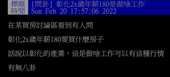明明才20出頭,卻有年薪百萬,聽起來跟上述一樣,似乎很難達成,但事實上,確實有人可以辦到!一位網友指出,在買房討論區看到有人詢問「彰化2x歲,年薪180要萬,要買什麼房子?」讓他看了超傻眼,「以彰化的產業,做啥工作能有這種行情?」