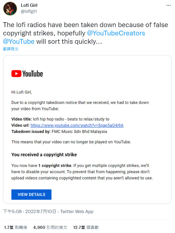 10日Lofi Girl透過推特公開一封來自YouTube的警告信,內容表示頻道影片經一間名為「FMC Music Sdn Bhd Malaysia」的公司檢舉侵權,該影片因此遭到強制下架。信中警告Lofi Girl頻道已有1次版權違規行為,若收到數次違規紀錄,頻道帳號將會被官方停權。