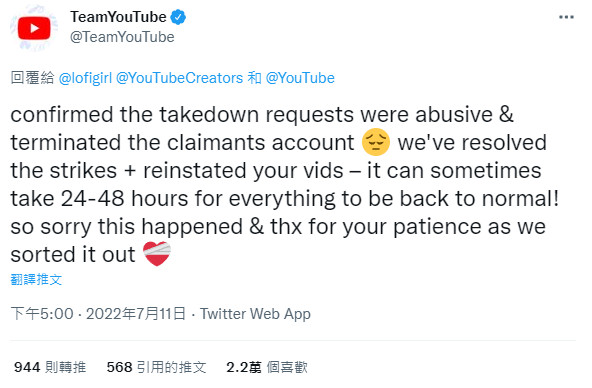 隔 (11) 天YouTube官方透過推特回覆Lofi Girl的澄清推文,對該下架影片遭有心人士濫用檢舉感到抱歉,也撤銷違規警告次數並承諾於接下來24至48小時內重新上架影片。所幸影片今 (13) 天已重新上架,Lofi Girl也推文感謝廣大社群的支持,並呼籲YouTube應更謹慎注意版權誤判問題。