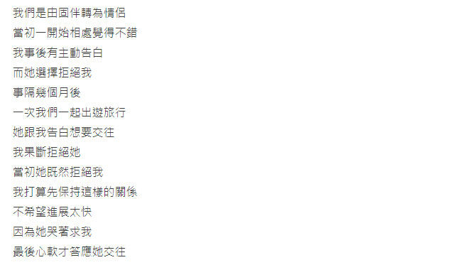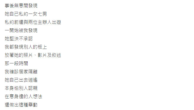 先前一位心力交瘁的男卡友在Dcard感情板上表示自己和女友交往未滿1年,是從固定跑友轉正情侶。當初原PO先告白被對方拒絕,幾個月後一起出遊換女方告白,本來他賭氣想緩緩,後來因為女友哭著拜託便心軟答應在一起。交往後原PO不主動跟別的女生聊天也不再約,某天無意間在推特上發現1女7男的紀錄片,才驚覺自己生病期間,「她自己出去逍遙」,而且運動會前還跟2位主辦男生出去玩。