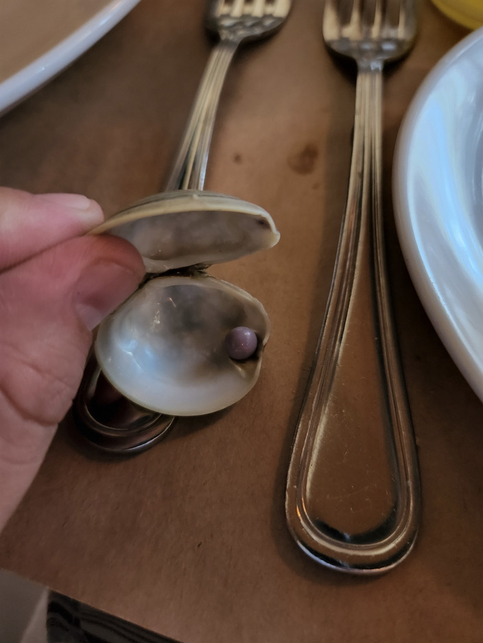 史考特和妻子原本以為是廚師做菜不小心餐混進髒東西,或是糖果,但仔細比對蛤蠣殼上的凹痕後,發現紫色珠珠極有可能是自然生長出來的。但夫妻倆從沒聽過蛤蠣也會產珍珠,詢問谷哥大神後才知道那真的是一顆紫色珍珠。