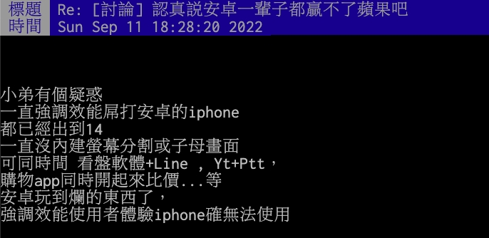 原PO指出,一直強調效能屌打安卓的iphone都已經出到14,一直沒內建螢幕分割或子母畫面,「看盤軟體+LINE」、「YT+PTT」、「購物APP」同時開起來比價等安卓玩到爛的東西,強調效能使用者體驗的iphone卻無法使用!