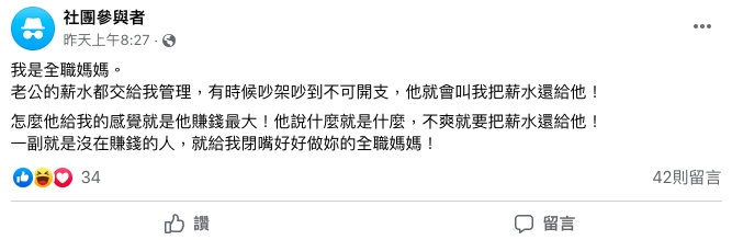 一名身為全職媽媽的網友在臉書「匿名2公社」抱怨,老公的薪水都交給自己管理,有時候吵架吵到不可開支,就會嗆「把薪水還給我!」原PO無奈地說,「怎麼他給我的感覺就是他賺錢最大,他說什麼就是什麼,不爽就要把薪水還給他,一副就是沒在賺錢的人,就給我閉嘴好好,做妳的全職媽媽!」