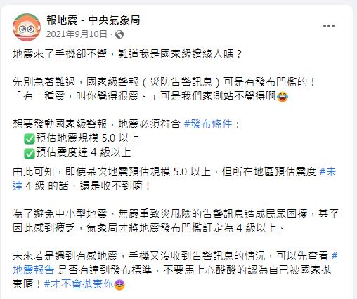 其實,中央氣象局臉書粉專「報地震 – 中央氣象局」就曾說明,國家級警報為了避免中小型地震、無嚴重致災風險的警告訊息擾民,甚至因此感到疲乏,因此發佈是有門檻的,必須達到「地震預估規模 5.0 以上」、「所在地區預估震度4級以上」中央才會發出警報。