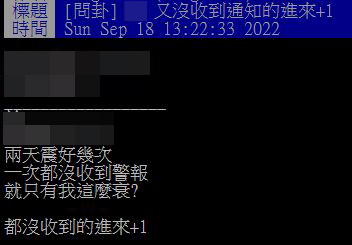這2日地震發生時你的手機警報有響嗎?一名網友就在網路論壇PTT上發文抱怨,「兩天震好幾次,一次都沒收到警報,就只有我這麼衰?」好奇是不是只有他變成國家級邊緣人。貼文曝光後,不少鄉民回報「從頭到尾沒收到」、「邊緣人,習慣了」、「很大我沒有」、「這兩天都沒收到,QQ」。