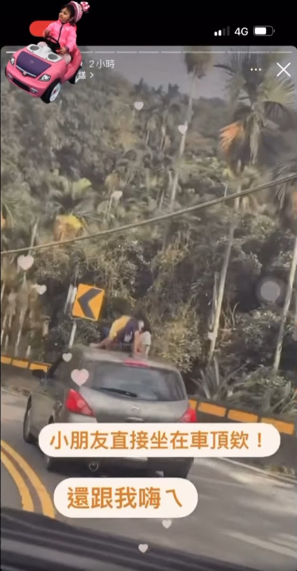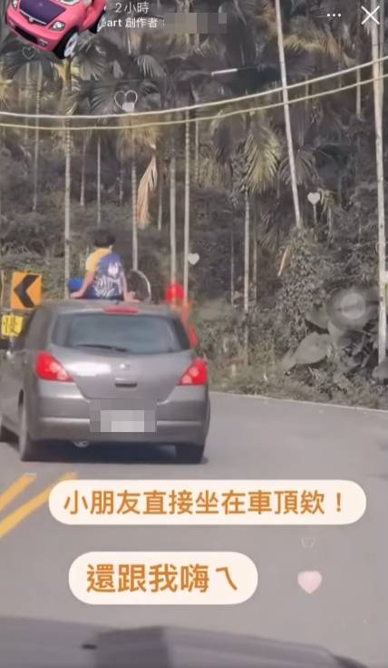 一名網友將Instagram限時動態影片轉貼至臉書社團《爆廢公社公開版》,標註事發地點為嘉義縣梅山三十六彎。影片中車輛行經山路,拍攝者驚呼前車車頂上竟然坐著2個人:「小朋友啦,那是小朋友!」2名孩童從車頂天窗爬出,轉頭望向後車鏡頭之外,甚至朝後方揮手打招呼。山路彎度幅度大,車內大人卻沒有管束孩子的作為,危險過程被記錄下來。
