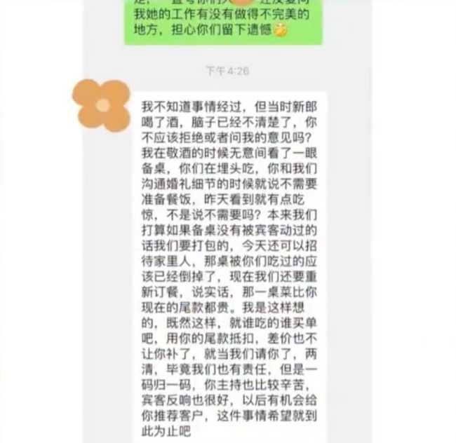 誰知隔天萬先生向新娘要尾款時,新娘卻稱雙方先前有約定,主持是不包含餐點的,「當時新郎喝了酒,腦子已經不清楚了,你不應該拒絕或詢問我的意見嗎?」萬先生和助理因為吃了備用桌的菜,導致她不能將菜打包重新招待親友,只能全部倒掉,她只好重新訂一桌菜,並直言「那一桌菜都比你尾款還要貴」,要求直接將費用從尾款裡頭扣,多出來的就當是請客不計較。