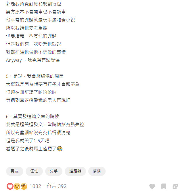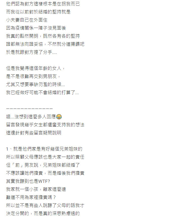 關於照顧父母,原PO認為是所有孩子的責任,有多位手足的男友卻反駁:「兄弟姐妹都結婚了,不應該讓她們擔責,而是婚後我們擔責。」原PO本身經濟條件不差,也看過太多婆媳糾紛的案例,決定道不同不相為謀、果斷提分手,卻難免陷入大齡女子的迷思:「這個年齡的女人是不是很難再交到男朋友?」為了寧缺勿濫做好不結婚的心理準備。