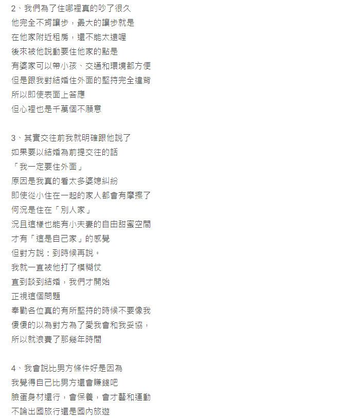 女卡友在Dcard感情版上表示就快滿34歲了,最近和相隔南北的遠距離男友分手。原PO一直都希望婚後夫妻可以自己成家,不要跟長輩同住。男友卻堅持要原PO婚後住進婆家,可以將房租省下來買車、育兒,未來也有人顧孩子,還信誓旦旦表示會把原PO「當公主一樣對待」。原PO家人不願看獨生女被拐走極力反對。
