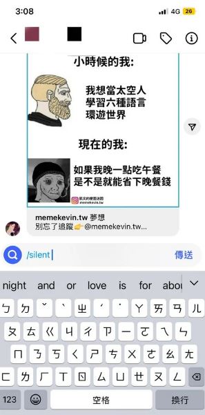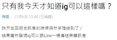 一名女網友在網路論壇Dcard上發文表示,她用IG回朋友訊息時,不小心手殘按到「/」,竟發現原來IG可以像LINE一樣傳送無聲訊息,訊息傳出後對方就不會跳通知。她無意間發現新大陸很興奮,「雖然我也不知道靜音傳送能幹嘛啦~但發現新功能就好酷!」