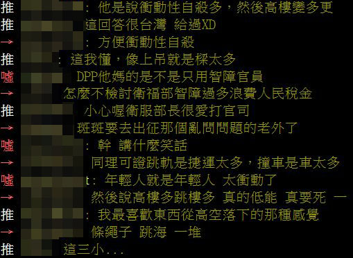 衛福部對兒少自//殺率年年攀升的回答曝光後,馬上在PTT引發熱議,怒轟官員把兒少自//殺率怪罪於台灣高樓太多實在太荒謬,「丟臉丟到國外去了」、「通通推給環境跟工具就好了,官這麼好當哦」、「扣除跳//樓?我沒看錯嗎?」、「神邏輯」。此外,台灣少年權益與福利促進聯盟、人本教育基金會也認為官員說法太離譜,要求衛福部公開道歉。
