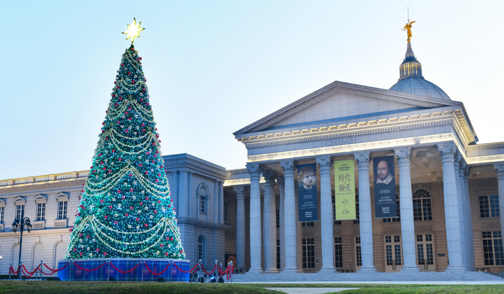 奇美博物館13公尺高的「幸福聖誕樹」今天率先登場為活動暖身,由於今年是奇美博物館三十週年,樹身特別以金黃色垂鍊、金色星體搭配繽紛彩球作裝飾,呈現華麗、高貴的慶典意象,底座則配合英國主題以蘇格蘭格紋為設計,整體視覺傳遞幸福、喜悅之情,搭配博物館的西洋建築風格,美麗景致預計再度成為民眾拍照打卡的熱點。幸福聖誕樹自即日起展出至明年1/11止,每日17:30至22:00點燈。「聖誕週末」夜晚將推出聖誕燈光秀,展現五彩斑斕的絢麗景致。